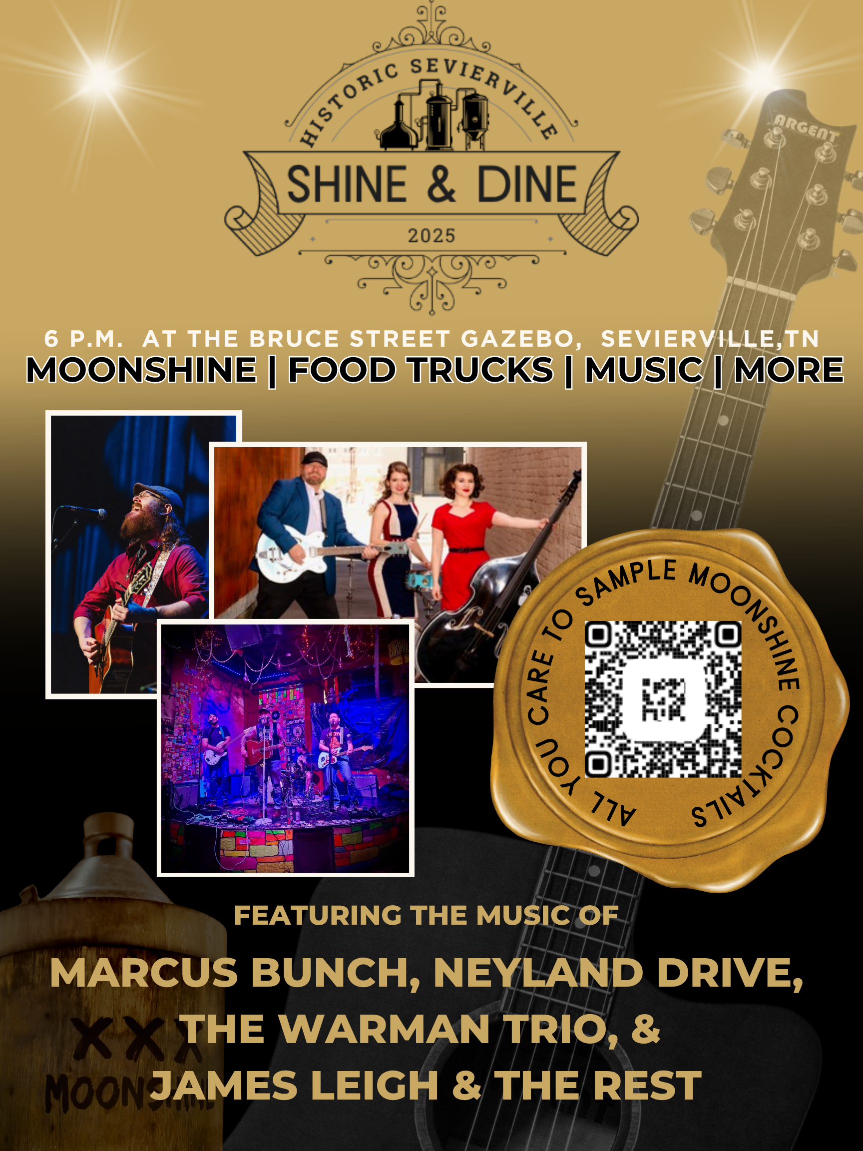Bruce Street Gazebo 136 Bruce Street, Sevierville, TennesseeMoonshine, Food Trucks, Music, and More! Featuring the music of: Marcus Bunch Neyland Drive The Warman Trio & James Leigh & The Rest